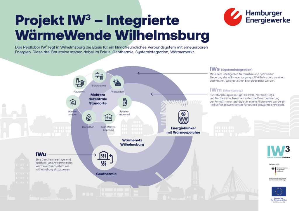 Das Ziel des Reallabors IW³ ist es, zu zeigen, wie ein zukunftsfähiges Wärmeverbundsystem aus erneuerbarer Wärme funktionieren kann. Dafür werden für den Hamburger Stadtteil Wilhelmsburg neue Technologien entwickelt und erprobt. IW³ besteht aus drei Bausteinen: Der Geothermie, der Systemintegration und der Konzeption eines Wärmemarkts..